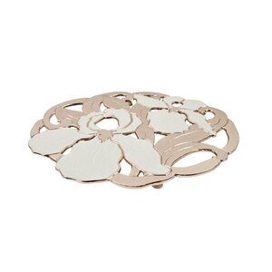 This vintage trivet by Wm.A.Rogers Ltd. features a stunning rose gold finish with white enamel floral detailing. Both functional and decorative.