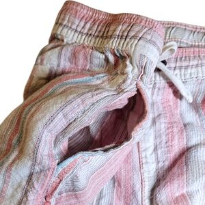These linen blend capri pants in size M feature a loose Lagenlook fit with a drawstring closure and elastic waist for comfort. The striped design gives off a coastal grandma vibe, perfect for spring and summer wear. The pants have a flat front detail and pockets, making them both stylish and functional. Ideal for casual or workwear occasions, they offer a breathable and easy-care fabric blend of rayon and linen.