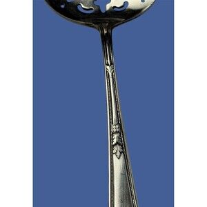 Antique Wm. Rogers & Son AA serving silverplate. Pierced tomato specialized flat server in the Mayfair pattern. Art Deco style introduced in 1923. Elegant ornate raised design in detailed leaf Art Deco styling. Pierced slotted construction allows juice and liquids to drain for serving. Crafted in the USA and marked WM ROGERS & SON AA on the handle back. Solid quality silverplate with beautiful dimensional detailing and normal antique use wear and patina. Ideal for antique silverplate collectors, Mayfair replacements, or sophisticated table use. Timeless luxury for serving tomatoes, fruit, vegetables, side dishes, or casseroles in mix-n-match silverplate dining.