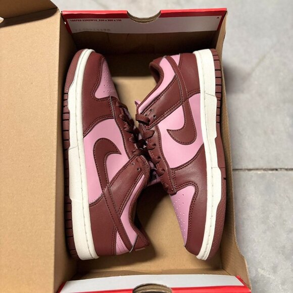 The Wmns Nike Dunk Low Next Nature in Pink Burgundy Red White is a stylish and comfortable pair of athletic shoes for women. Featuring a low top design and lace-up closure, these sneakers are perfect for casual occasions. Made with a leather upper, rubber outsole, and foam insole, they offer both durability and comfort. The pink color with logo accents adds a touch of style, while the nature theme makes them a fashionable choice for all seasons. Perfect for walking and everyday wear, these Nike Dunk shoes in size 7.5 are a must-have addition to any wardrobe.