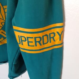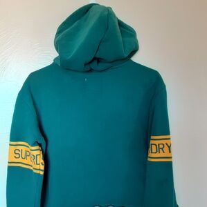 Green and Gold Wmns Superdry Hoodie with raw edge hemline.