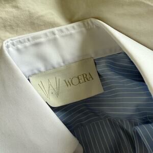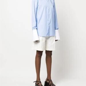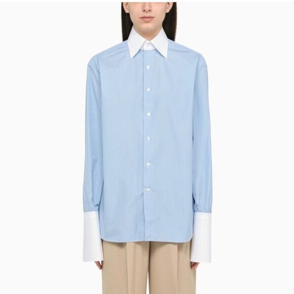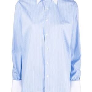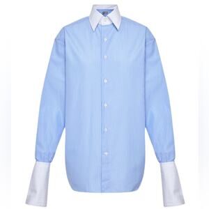 elevate your wardrobe with Woera’s best-selling signature button-up in blue pinstripe. a favorite amongst our customers, this versatile piece effortlessly transitions between casual and upscale looks. pair it with jeans for a casual, relaxed vibe, or tuck it into a midi skirt and add heels for a sophisticated ensemble that's perfect for any occasion. it features our signature exaggerated double cuffs, an oversized fit, contrasting cuffs and collar, our mother-of-pearl buttons, and a point collar.