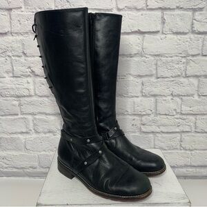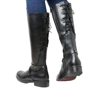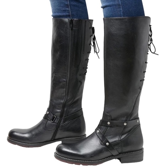 The Belmore is equipped with beautiful details such as lacing at the back allowing for adjustability around the calf as well as cross-tolded straps with studs around the instep. The boot has a lovely heel height providing comfort.