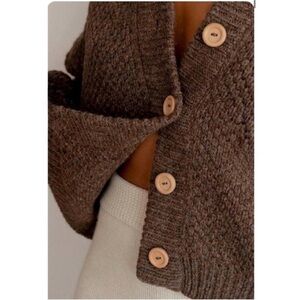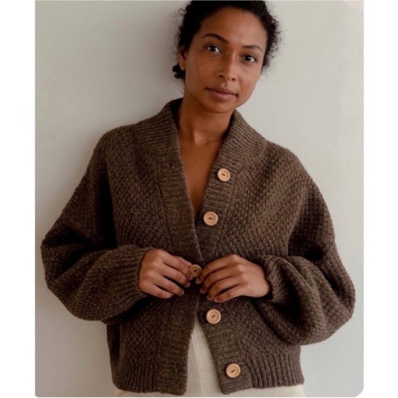 Cropped wide cardigan with wood buttons and a high rounded collar. Overall stitch detail for a bulky texture.