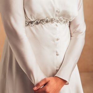 Elegant mini dress made of pure silk with a diamond detail around the waist. Fluttering at the bottom, with straight sleeves and slightly accentuated shoulders. Perfect as a casual beach wedding dress or rehearsal dinner dress. I bought it for my rehearsal dinner, but ended up finding something else. Still in original packaging. The store won't accept the return as I'm out of their 14 day return window. You can find the dress listed on Wolf & Badger.