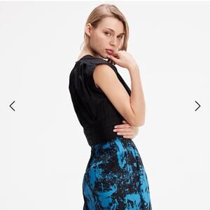 A piece available either in a plain cotton or in an elegant abstract print. A trendy cut with its large structured shoulders structured by folds, its wrap effect in front and its fitted waist. To match with our ""Buttoned straight cotton skirt "" or with high -waisted jeans.