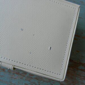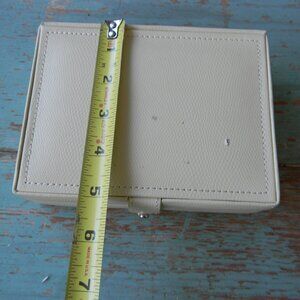 Wolf Designs for Pottery Barn BEIGE Travel Jewelry Box , TOP HAS A FEW KNICKS TO THE LEATHER AS SHOWN, ONE PINK STAIN ON FRONT AS SHOWN. INSIDE IS IN EXCELLENT USED CONDITION. MIRROR INSIDE,