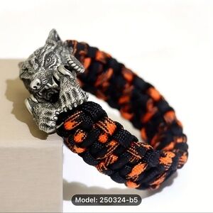 Embrace bold style with this striking paracord bracelet featuring a detailed wolf head design. The black and orange colors add a vibrant touch to any outfit. Beautiful