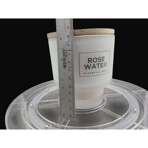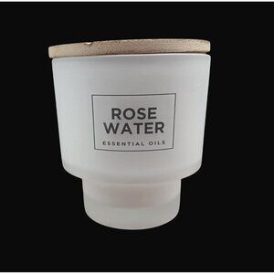 A luxurious candle designed with a frosted glass jar and a wooden lid, infused with rose water essential oils for a calming ambiance.
