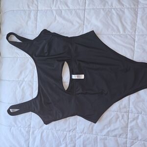 Stylish black one-piece swimsuit with a chic cutout design. Perfect for a sleek and modern beach look.