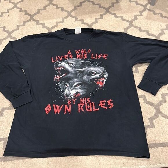 Wolf lives his life by his own rules long sleeve graphic tee on fruit of the loom tag size L awesome graphic on chest