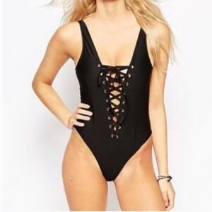 Gorgeous chic one piece swimsuit by Wolf & Whistle. Plunge lace front detail. Scoop back and cheeky bottom. Excellent condition!