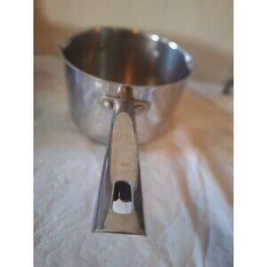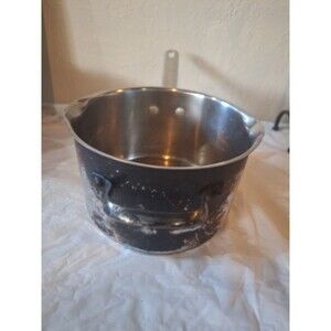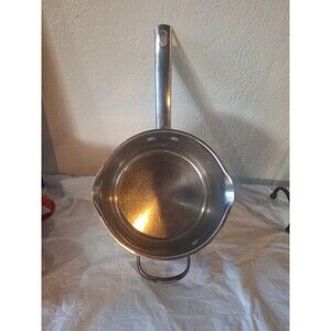 The Wolfgang Puck Bistro Collection 4 Qt Sauce Pan Pot is a high-quality stainless steel saucepan. Double pour sided pan. No Lid. Well loved. Has some carbon build-up