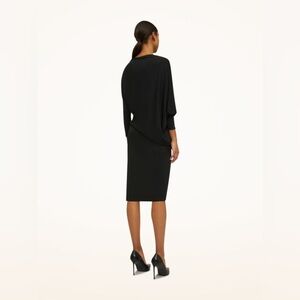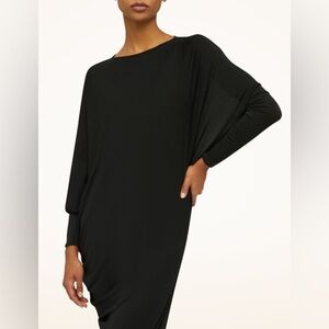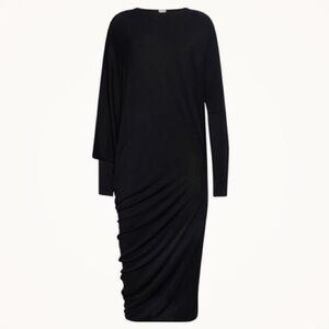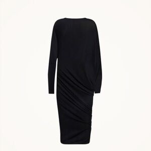The flowing material of the long-sleeved dress can be draped over the body in different ways to achieve a custom fit. A crew neck and slim sleeves lend structure to the soft silhouette.