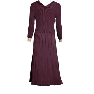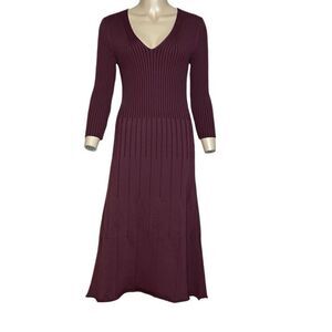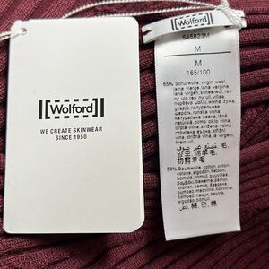 $795 Wolford Merino Wool Rib Dress. Hot trendy color Burgundy - Oort Royale. Size M. Fabric: 65% of Virgin wool, 33% of cotton and 2% of elastan - magic mixed - machine cold extra gentle cycle. The Plush Merino Rib sweater dress offers a modern twist with its deep V-neckline. Crafted from a blend of ultra-soft merino wool and cotton, this dress features an A-line shape enhanced by ribbed patterns that define the body's natural curves. The look is completed with ¾ length sleeves that fit snugly. The use of a 14-gauge knit and varied ribbing at the skirt create a distinctive, flattering silhouette. Perfect dress for coming season.