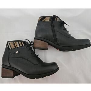 Wolky Black Leather Lace Up Stratton Ankle Boot sz 37 (US 6) $219 NWOB Casual. Wolky Stratton adds a luxe textural element to any outfit. Premium leather upper includes a collar with woven stitching, a decorative wraparound tie and zip closure. Leather lined uppers allow shoes to breathe and absorb perspiration. Removable leather-covered footbeds are comfortable, durable, and absorb perspiration.