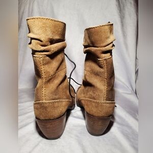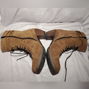 Make a statement in the the highly fashionable Wolky Dhofar women's boots. Crafted of a suede upper, this unique boot has an elegant-cool vibe to it, with its eleven eyelet front and stylish scrunched shaft. The best part is the inside zipper, so no fusshng with the long laces - just tie once and you're set. A beautifully tapered heel and platform front add height while providing stability. The interior is lined in leather and the removable footbed provides arch support while allowing for customization. The TR rubber outsole ensurse durability and proper traction control for sure footedness with every step. Catch the eyes of all admirerers in the Wolky Dhofar women's boots.