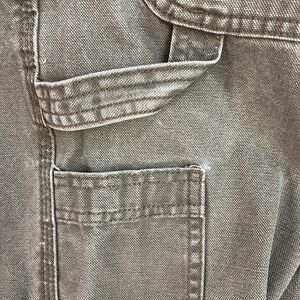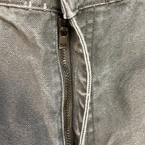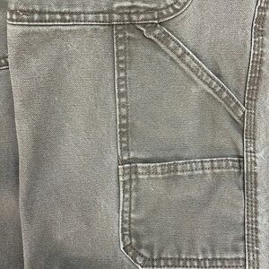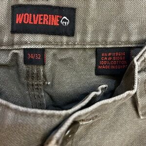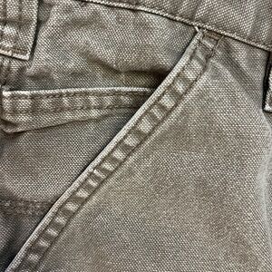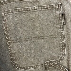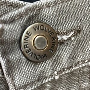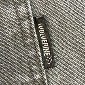 Wolverine Gray Canvas Carpenter Pants. Flat Front. Straight Leg Baggy. 100% Heavy Cotton. 8 Pockets plus loop. Brass tone hardware. Machine wash/dry.