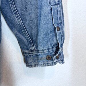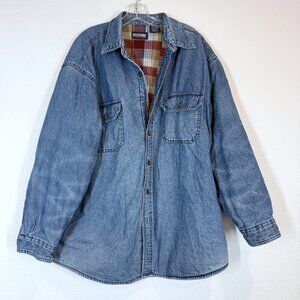 Stay warm and rugged with this vintage Wolverine Boots and Gear denim shirt jacket. Classic medium-wash 100% cotton denim outer shell with a warm and soft plaid flannel lining in red, tan, and white tones. Designed for durability and comfort, it features: