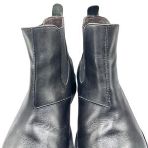 These are a classic pair of black leather Chelsea boots. They feature a sleek, ankle-high design with elastic side panels for a snug fit and a pull tab on the heel for easy on and off. The boots have a low, stacked heel and a smooth, rounded toe, making them a versatile choice for both casual and dressier occasions.