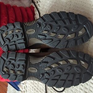Rugged Wolverine boots for outdoor use. Black and brown design. Provides excellent support and comfort.