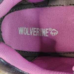 Black with pink lining and steel toe features slip-on work shoes. Comfortable pink lining and 100% full grain leather materials. Built to withstand the toughest of environments and provide all day comfort. Opanka construction, Wave mesh lining and pillow cushion foot bed. Durable design by Wolverine. Minor wear. Has scuffs, marks and crease on leather, good rubber sole. Please zoom in photos for the best description.