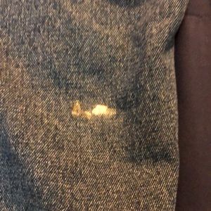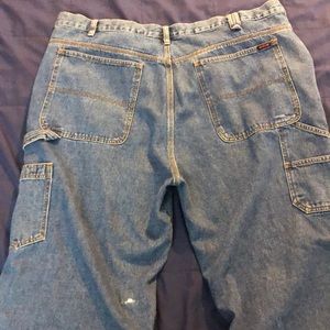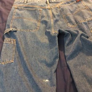 42x32 Blue work jeans with utility pockets and hammer loop. Small spit on rear of left leg, possibly dried glue. Otherwise great condition, soft and comfortable.