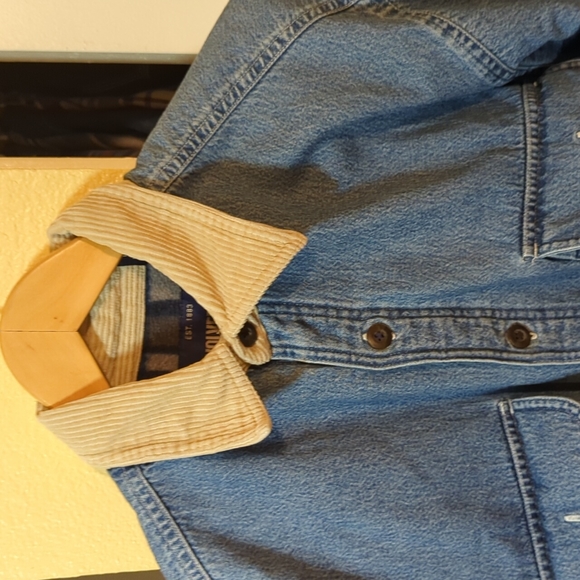 Medium Wolverine shirt jacket. corduroy collar. polyester flannel lined interior. Nylon lined sleeves. denim outer shell. missing buttons on the chest pockets. all other buttons intact.