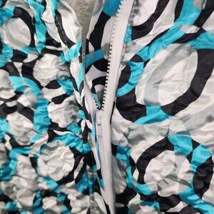 This Ruby Rd. jacket features a crinkle texture and a vibrant blue, black, and white pattern. Ideal for women seeking a stylish yet comfortable outerwear option.
