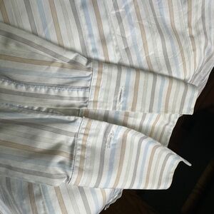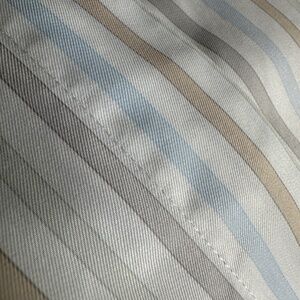 100% Cotton feels like a heavy silk. Fitted, with button hidden placket for a dressier look when you want it. White base with large beige, light blue and grey stripes. Great with jeans, suits, a sweater or anytime. Condition - good used condition. No rips, tears or snags.