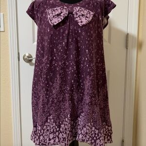 Loose form dress with medium bow Fleece fabric Purple with white patterns
