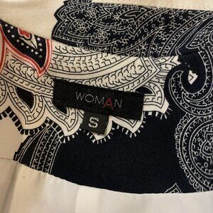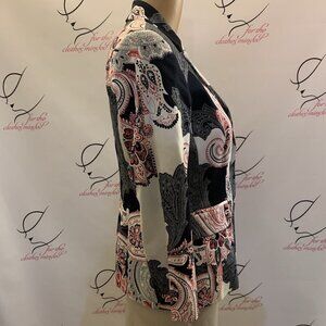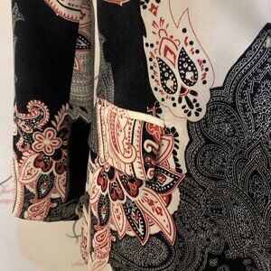 Woman. Size Small. Never Worn. Cotton Blend. Lined 3/4 Sleeve Jacket. This is my jacket and I have no idea why I have never worn it because it is so pretty. Faux pockets. Center back 23". 3/4 Sleeves 19". Bust 18/36". Dry Clean.