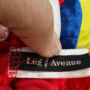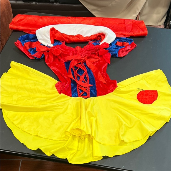 Enchanting Snow White costume for adults, featuring vibrant red, blue, and yellow colors. Perfect for dress-up and imaginative play. I wore it once for a Disney Race. It does have a few spots on skirt that are very light to see, but none the less, slight. The cape snaps on! Super comfy and easy to run in the is another race coming up in January/ February! Please see pictures for condition!! Size S/M.