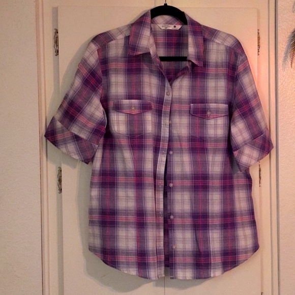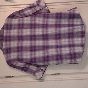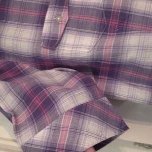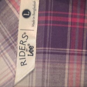 It is a beautiful Shirt , Riders by Lee, good w Jeans. size L. It is purple, white, red and blue. Never used