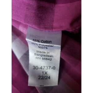 Add a touch of Western style to your wardrobe with this Woman Within button-up shirt in a beautiful plaid pattern. The classic collar and hemline styling add a feminine touch, while the long sleeves with buttons at the cuffs keep it practical for any occasion. Made from lightweight cotton material, this tunic-style shirt is perfect for all seasons. It comes in a stylish purple color with accents of pink and a button-up closure. This shirt is perfect for casual occasions and can be paired with jeans or skirts. Its regular fit and size type ensure that it is suitable for women who wear size 1X. Whether you're going for a cowgirl or cowboy look, this shirt is the perfect addition to your collection.