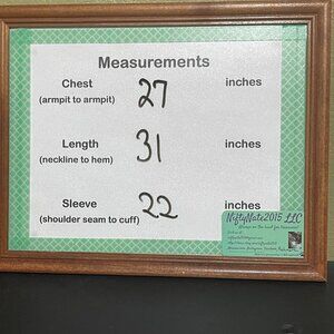 Chest = 27 inches, Length = 31 inches, Sleeve = 22 inches. No visible flaws.