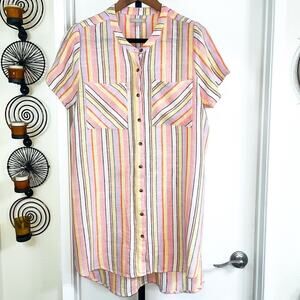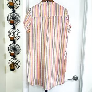 Woman Within Linen Blend Button Up Tunic Top - Pink Yellow Stripe, Size 14 / 16