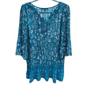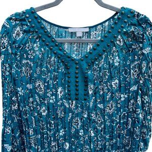 Woman Within NWOT Embellished Pleated Blouse Teal Blue Floral Flare Sleeve