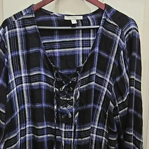 Woman Within Navy Plaid Drawstring Pullover Soft Plus Size Top Sz 1X