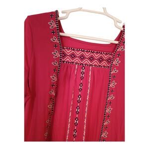 Not a bright Pink. New without tags please review the photos measurements are in them. The Woman Within Pink Embroidered Square Neck Tee Tunic Top in size 1X is a stylish and versatile addition to any woman's wardrobe. This tunic top features a beautiful floral pattern with embroidered accents, a collared neckline, and long sleeves for added warmth. Made of soft rayon material, it is perfect for casual occasions year-round and can be paired with leggings or jeans for a comfortable and chic look. The button-up closure adds a touch of sophistication to this plus-size top from the trusted brand Woman Within.