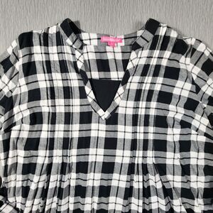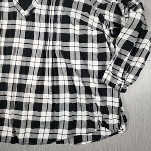 Add a touch of classic elegance to your wardrobe with this Woman Within pleated V-neck blouse in black and white plaid. Made from 100% cotton woven fabric, this relaxed-fit tunic is perfect for travel, workwear, or casual outings in any season. The long sleeve, button closure, and casual sleeve type make it a versatile piece that can be dressed up or down, while the breathable and easy care features ensure it is always comfortable to wear.