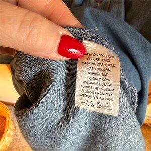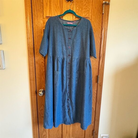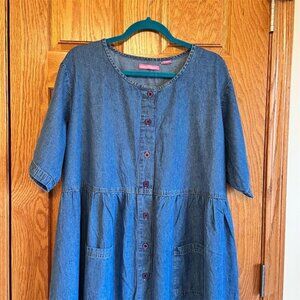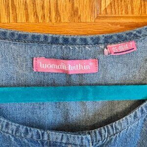 This Woman Within plus size denim dress is designed for casual occasions. It features a knee-length cut and short sleeves, offering a comfortable fit. The dress is blue and made from breathable denim, with a button closure and two front pockets. It is machine washable for easy care. The dress is pre-owned very good condition
