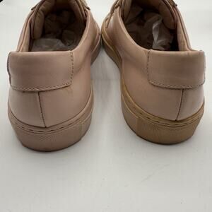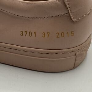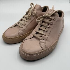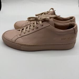 Woman by Common Projects Tournament Low Top Sneakers Pink Size 37. Previously owned with signs of wear like one of the rubber soles is a different color, scuff marks and a spot on the tongue, all pointed out in photos. In overall good wearable condition. Leather and bottom soles are still very solid.
