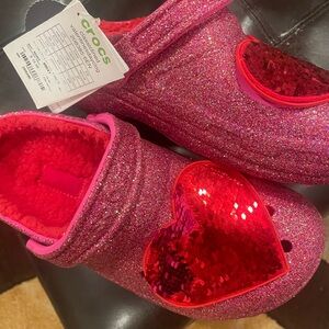 Woman crocs hot pink with fur lining and pink glitter & heart sequin on top from smoke & per free home