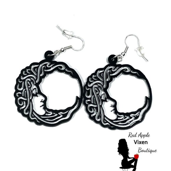 Gaze upon the enchanting silhouette of the Woman in the Moon! Beautiful acrylic earrings are intricate details. Black acrylic design is attached to a clear back to give it a little bit of shine. These earrings measure approximately 1.5 inches wide and high. Lightweight with fish hook clasps