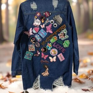 Women’s size small patch jacket featuring expressive patches. Truly one of a kind with no duplicates. A standout piece that’s perfect for any occasion.