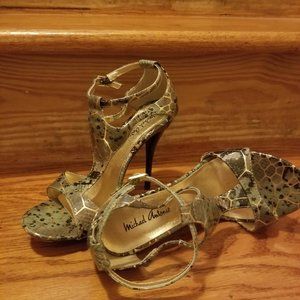 Size 6 beautiful & sexy Green/black/gold snake skin look open toe 4 1/2" heeled sandal. Originally bought in Vegas and Worn just a few times.