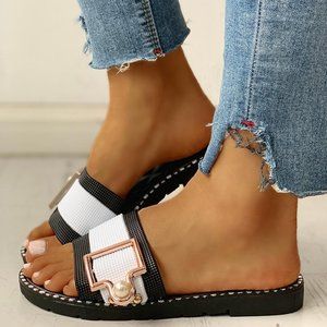 Give your ensemble all the glam with these BUCKLED sandals. This color-block open toed sandal is fashioned with sparking rhinestones and a round toe for extra appeal!