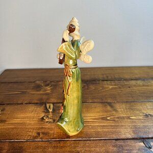 Woman with Wings Playing Mandolin Fairy Angel Ceramic green Figurine