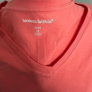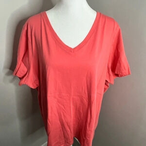 Woman within cropped tshirt. Color is a pink/ salmon. Good used condition. Size 1x. V neck 100% cotton